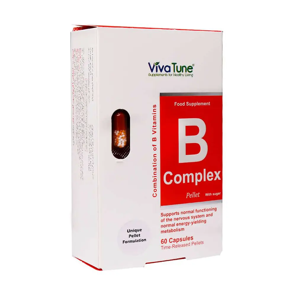 پلت آهسته رهش ب کمپلکس ویواتیون حاوی همه 8 نوع ویتامین ب است. ویتامین های ریبوفلاوین، نیاسین، پانتوتنیک اسید، ب6، ب12 و فولات می توانند در رفع خستگی و کسالت موثر باشند. علاوه بر این، ویتامین های ب1، ب 2 و ب3 در متابولیسم های تولید انرژی در بدن دخیل هستند و از این طریق عمل می کنند. ویتامین ب 6 در متابولیسم نرمال پروتئین و گلیکوژن در بدن عمل می کند. ویتامین های ب 12 و فولیک اسید نیز در پروسه تقسیم سلولی دخیل هستند و بدون آنها تولید DNA امکان پذیر نیست. ویتامین ب کمپلکس عملکردهای وسیعی در بدن دارد. ویتامین B-5 یا اسید پانتوتنیک برای سلامت مغز و سیستم عصبی ضروری است.
