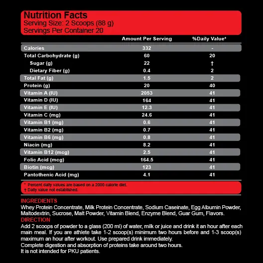 هر سروینگ شامل دو پیمانه از پودر است که حدوداً ۹۰ گرم وزن دارد و این بسته حاوی ۲۰ سروینگ کامل است. مقدار پروتئین، کربوهیدرات و کالری بهگونهای است تا ضمن افزایش وزن، از تجمع چربی غیرضروری در بدن جلوگیری کند.
