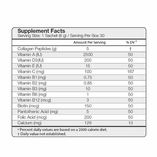 - دوز کلاژن اثربخش و علمی: هر ساشه یا پیمانه شامل ۵ گرم کلاژن هیدرولیزه است.