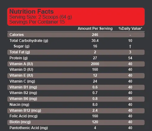 هر سروینگ شامل دو پیمانه از پودر (حدود ۹۰ گرم) است و این بسته حاوی ۱۵ سروینگ کامل میباشد. نسبت پروتئین و کربوهیدرات بهگونهای طراحی شده که افزایش وزن با حداقل چربی اضافی صورت گیرد.